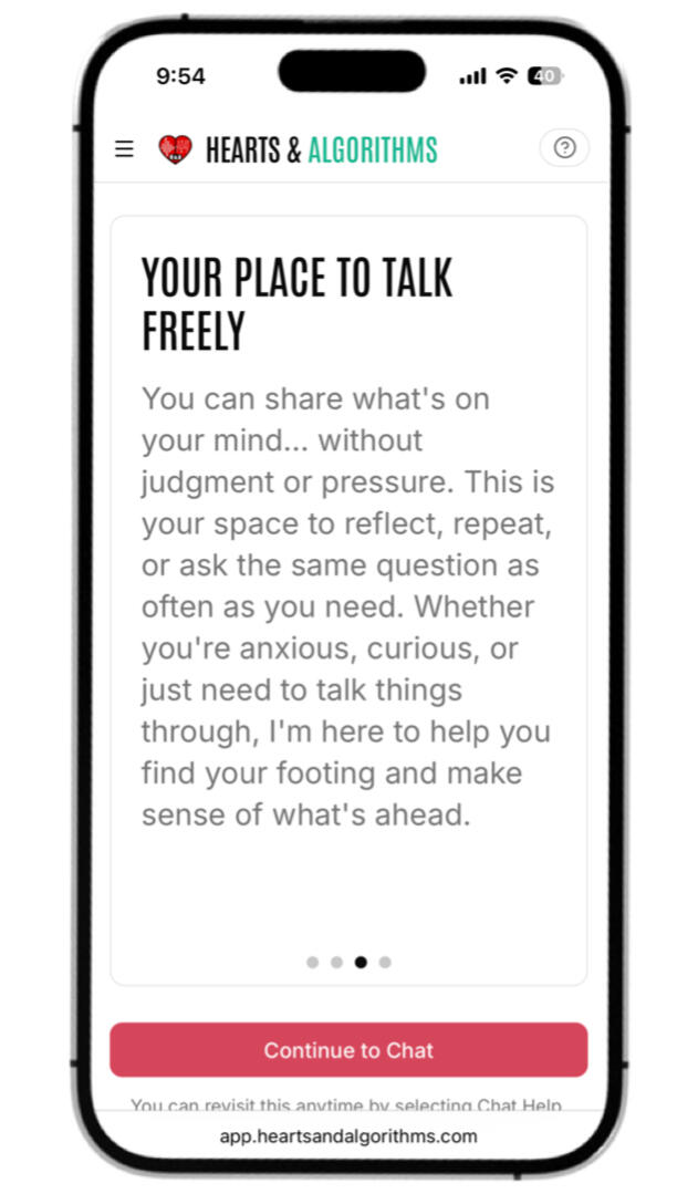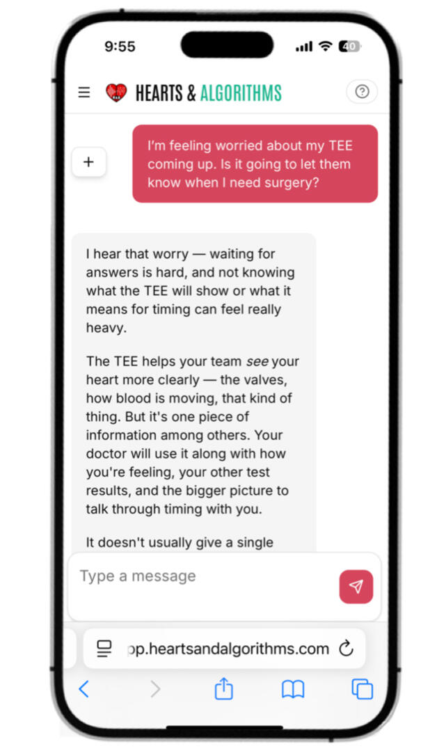 Hearts & Algorithms is an emotional support companion for cardiac patients and caregivers, designed to help people think clearly, feel supported, and stay grounded throughout the cardiac journey.
