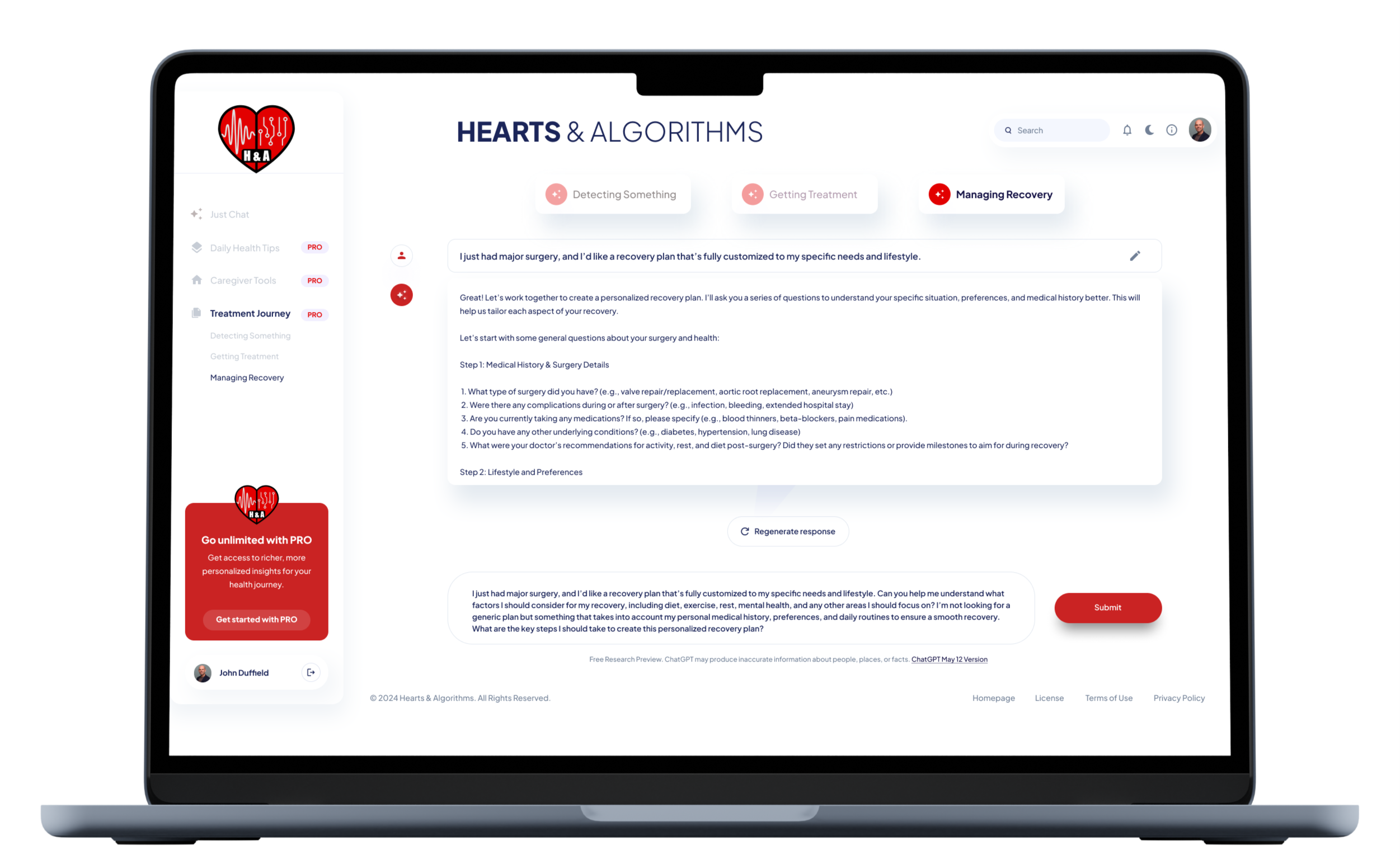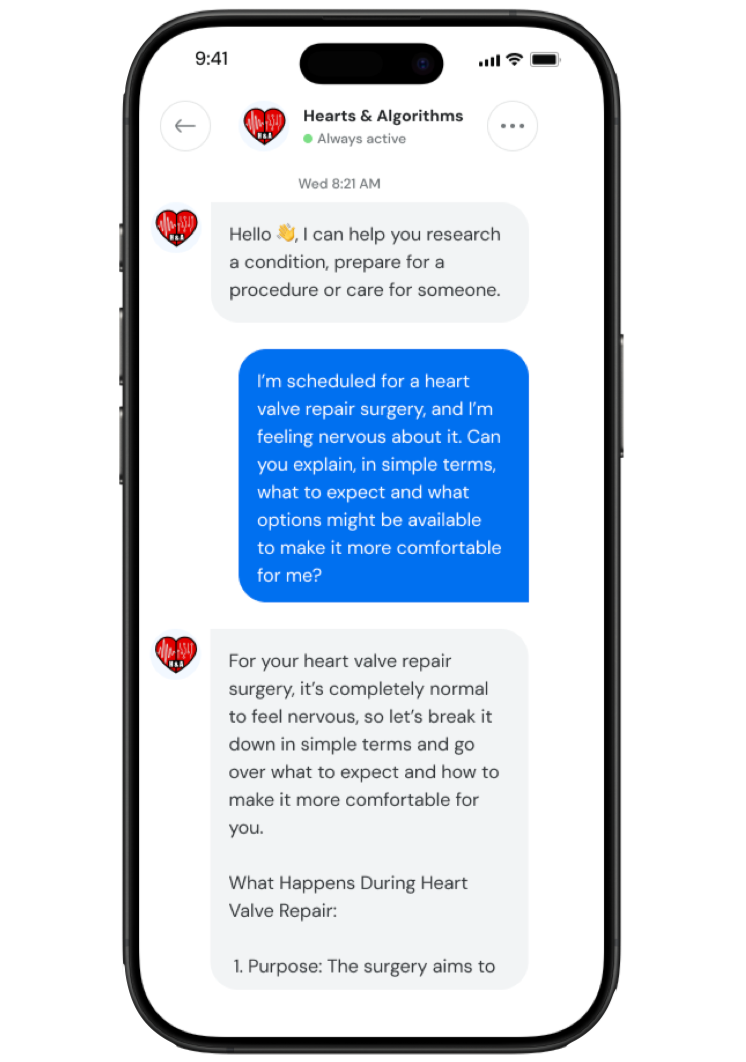 You can’t have your doctors and nurses available every moment, so Hearts & Algorithms is there to support you 24/7.Reduce anxiety, gain clarity, and feel confident navigating your healthcare journey without relying on endless online research, unverified sources, incorrect advice, or scary stories that only increase confusion and stress.Because your heart deserves clarity- not confusion.